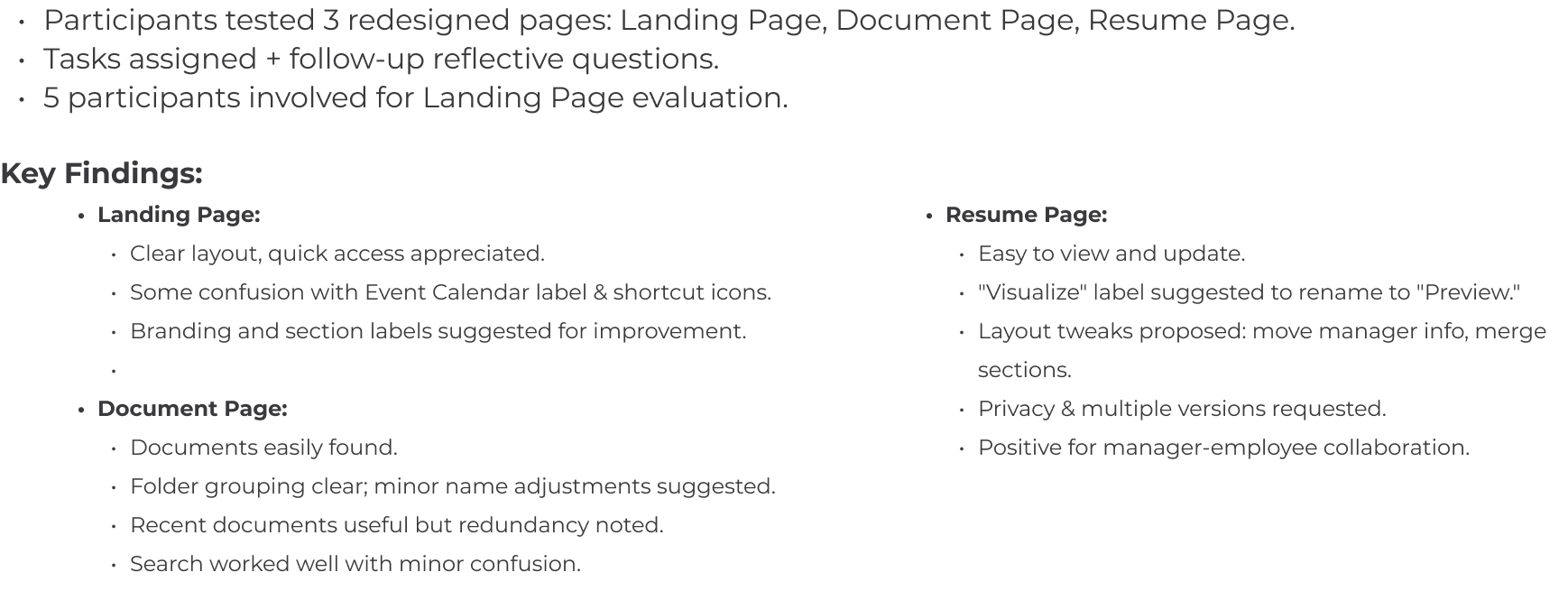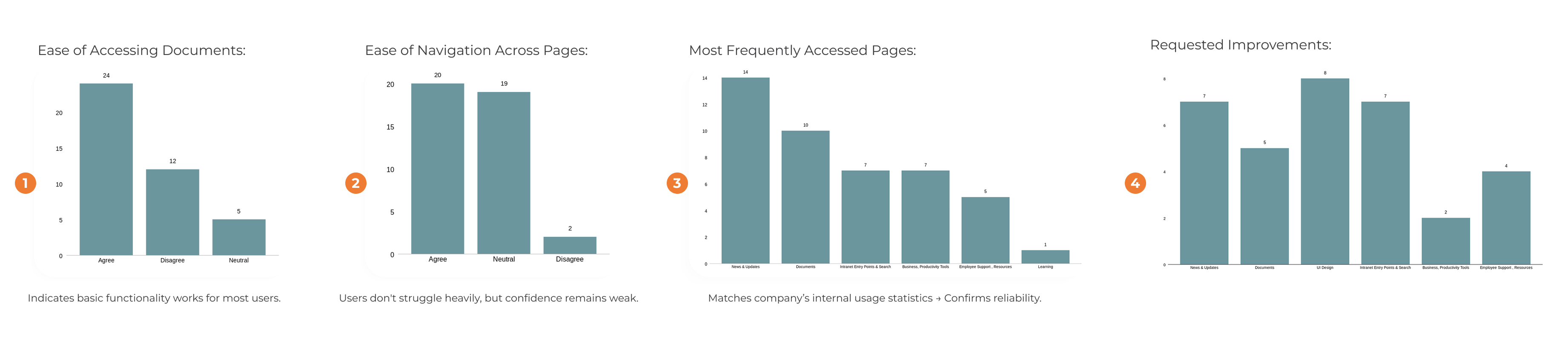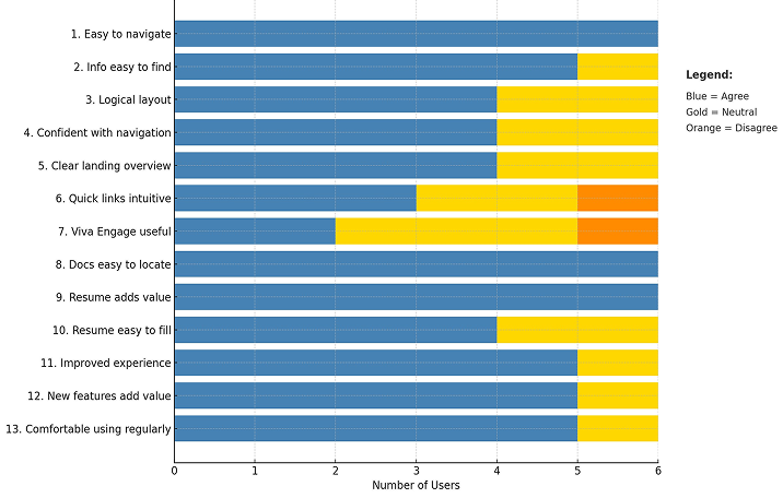 As the graph below shows, responses were mostly positive users felt the intranet was easier to navigate, and features like document access and the resume page were seen as valuable and easy to use.