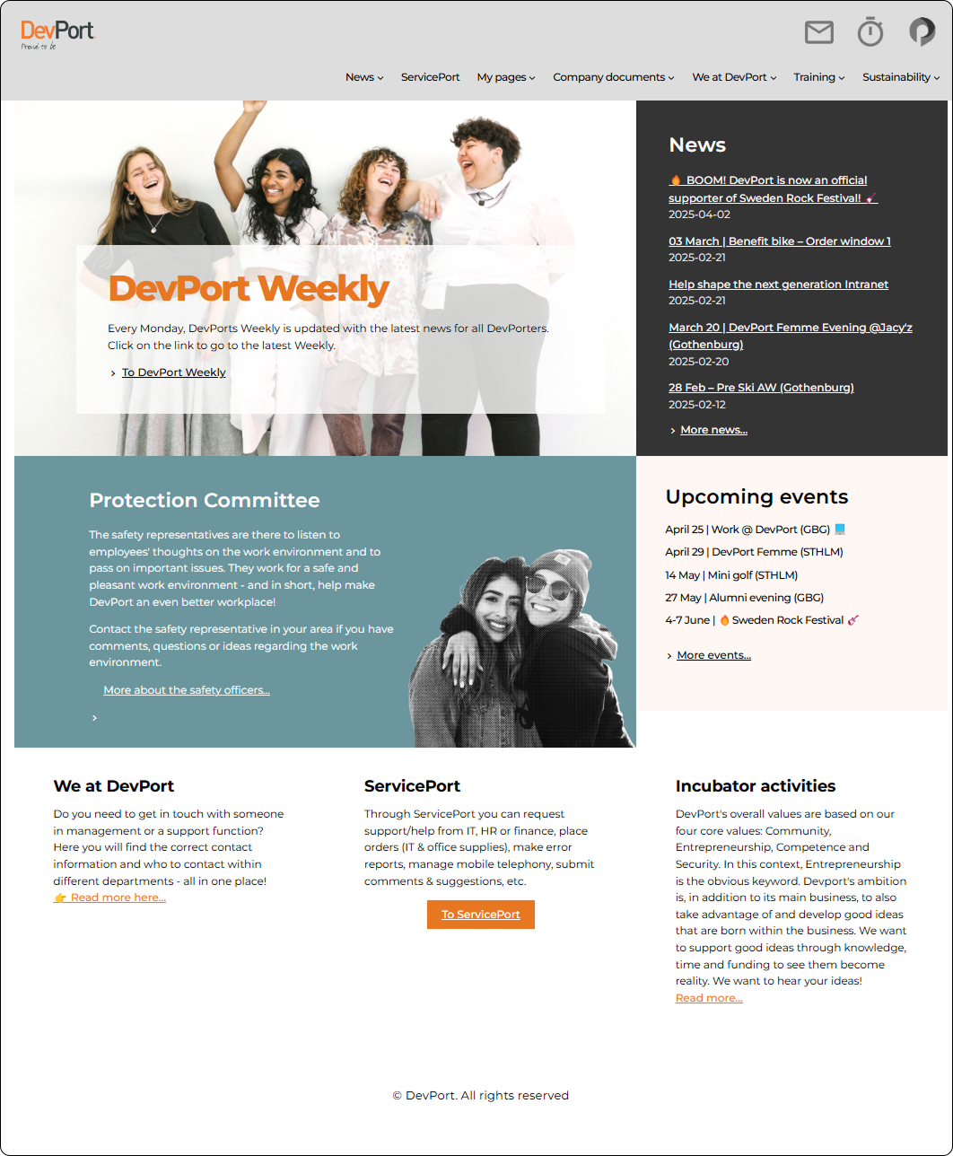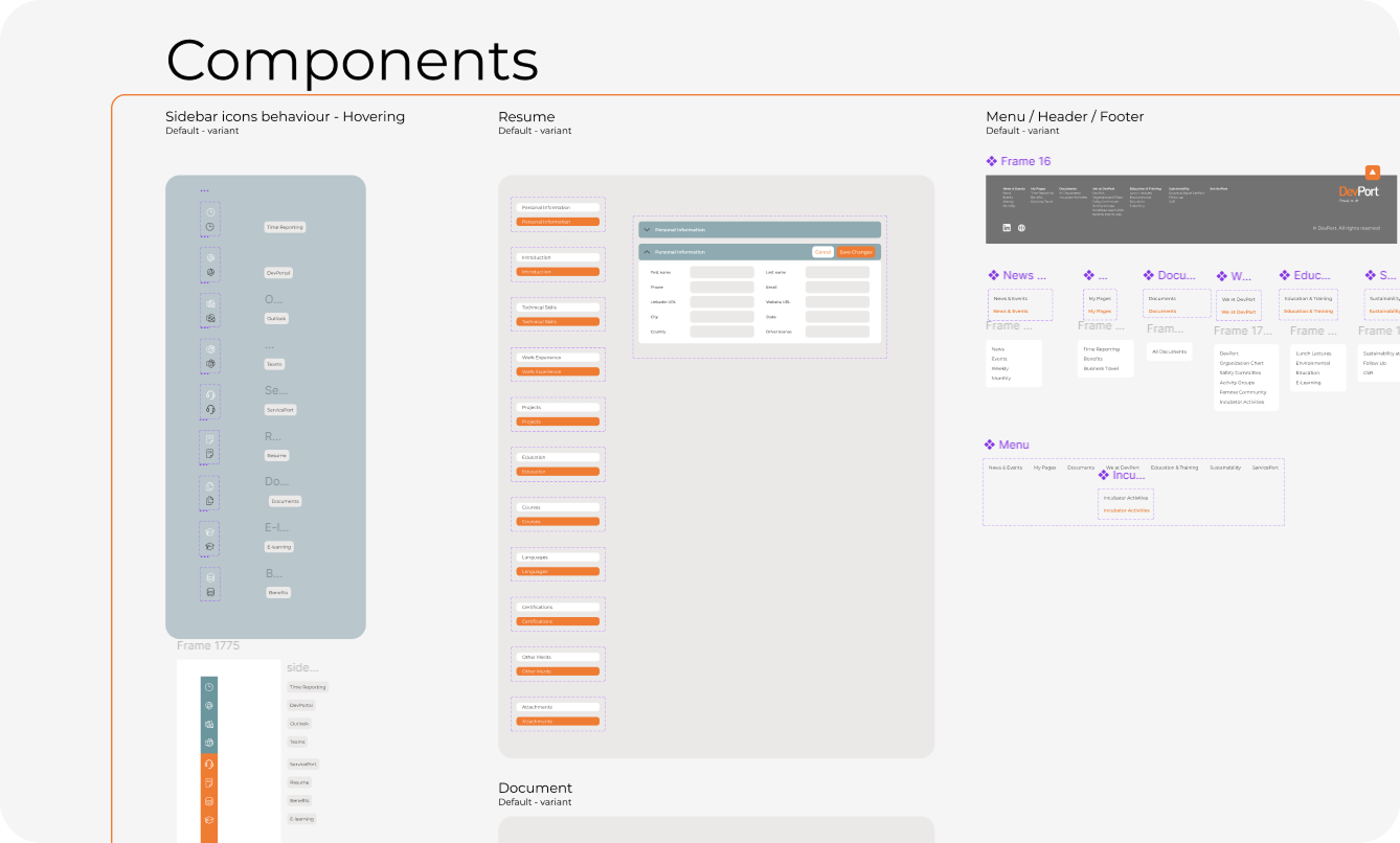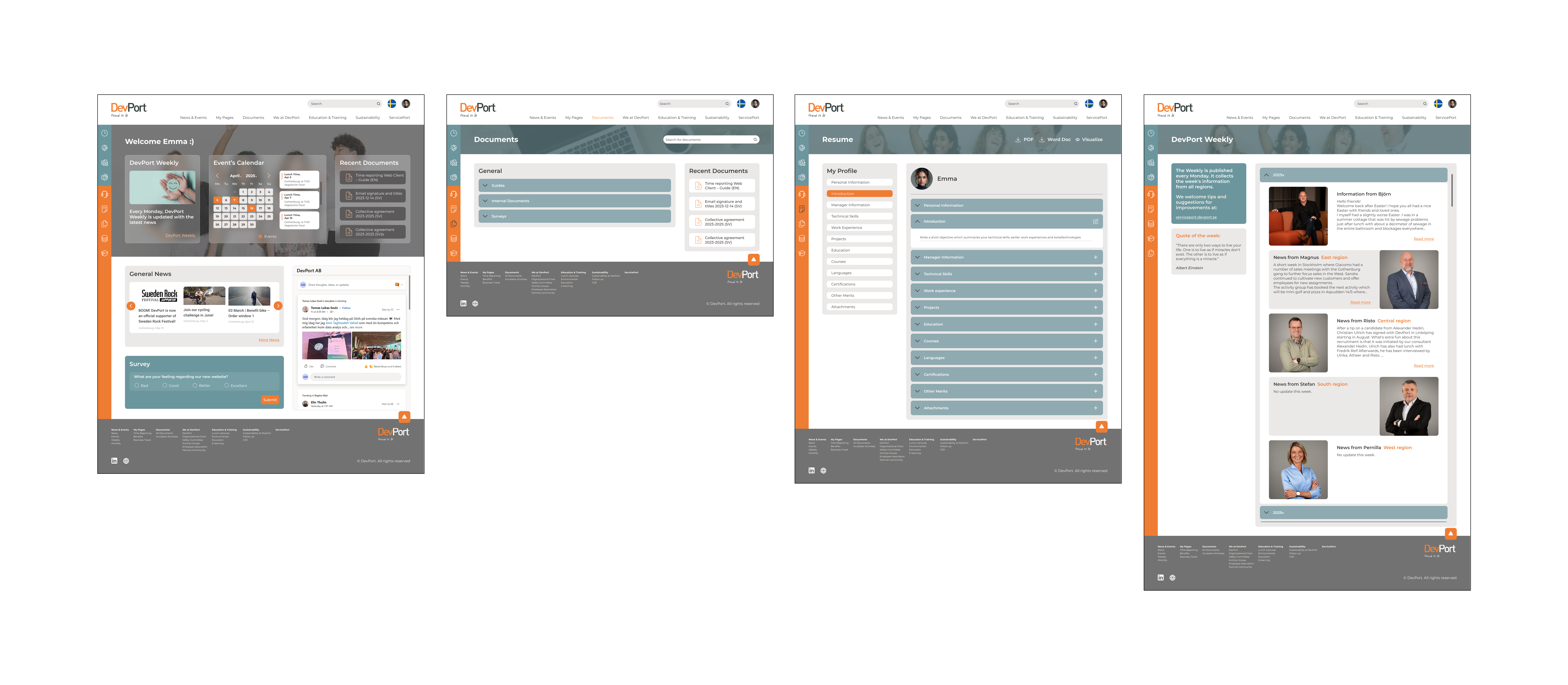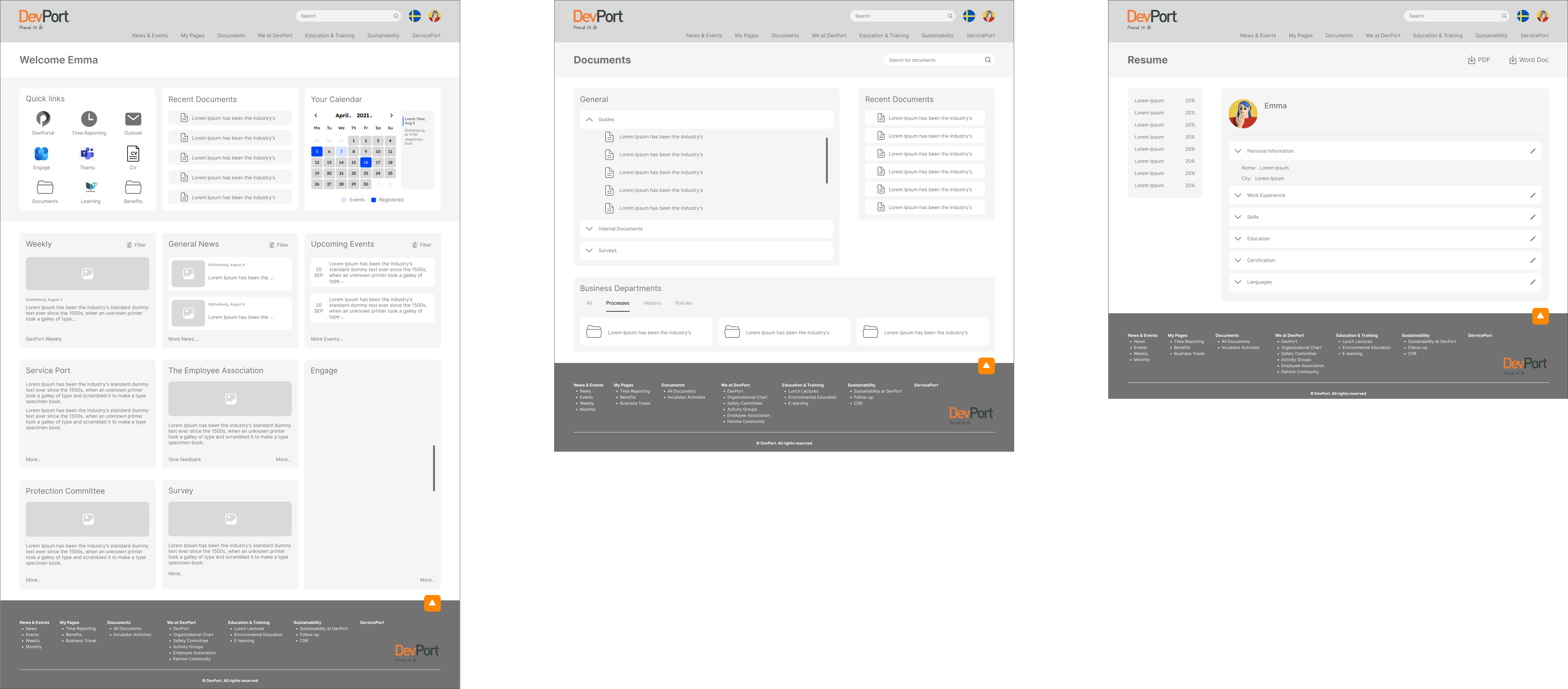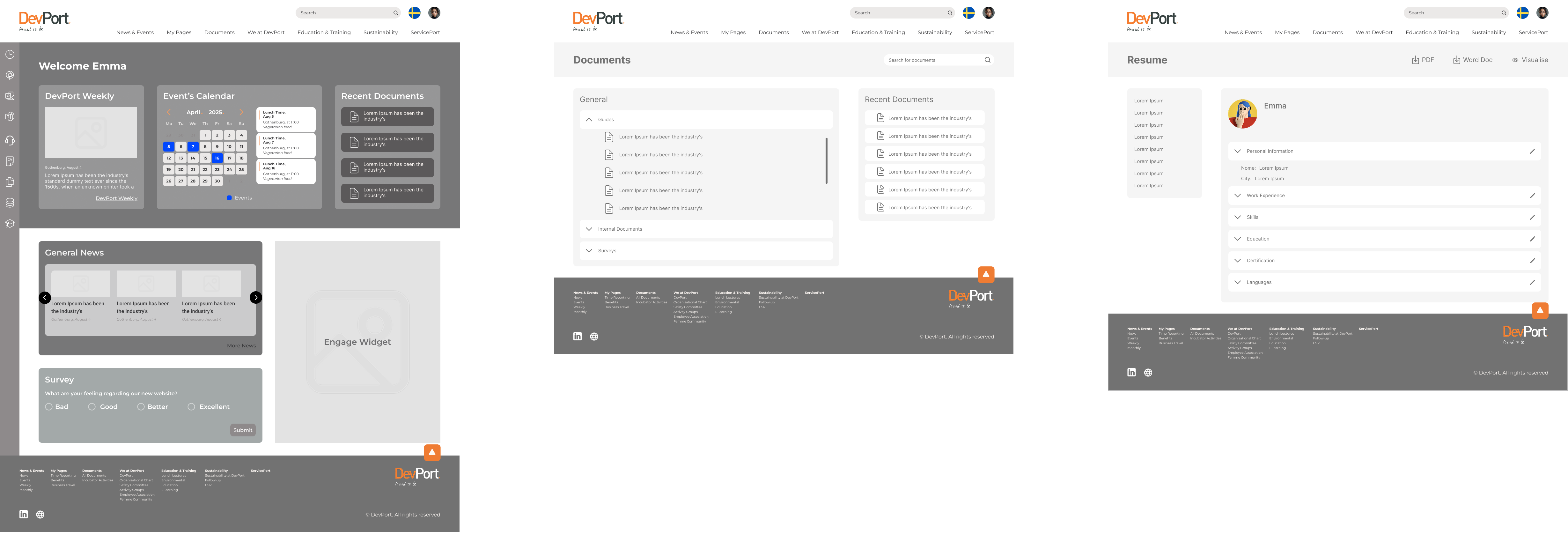 Based on the researches aligning the user and stakeholder requirements, we had defined the main pages: Home, Documents and Resume. The DevPort Weekly was done last, we wanted to show how a well-structured design can contribute to the development of a web environment.